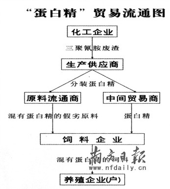 正是从那时开始,三聚氰胺开始流入饲料行业。广东粤海饲料集团董事长郑石轩认为,三聚氰胺废料变身后的“蛋白精”在饲料行业中至少已经存在了五年,且愈演愈烈。