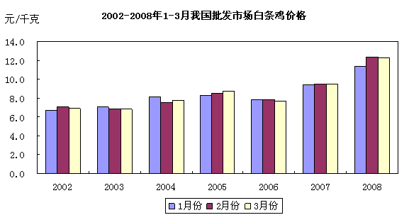 一季度我国禽肉价格继续保持上涨趋势。2月中旬创历史新高,下旬价格回落,3月中旬反弹回升。从全国批发市场价格来看,一季度白条鸡平均价格为12元/千克,同比上涨26.78%。其中,2月中旬白条鸡*高价达到12.9元/千克,创历史新纪录,2月下旬12.4元/千克,比中旬有所回落,但比1月份上涨了8.7%,3月中旬价格开始反弹,全月均价为12.3元/千克,与2月基本持平。