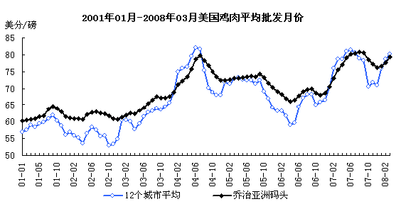 由于屠宰量增加以及家禽单体重量的增加,一季度预计美国禽肉产量达到90.75亿磅,比2007年同期增加5.2%。目前由于鸡存栏数仍比去年同期增加3%,预计二季度美国禽肉产量将增加到94.0亿磅,2008年美国禽肉产量可能达到371亿磅。