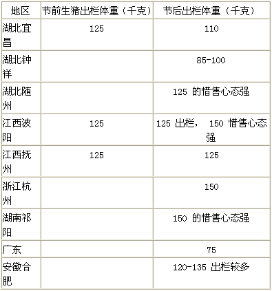 由上表可以看出,目前的出栏状况比较混乱。南方部分地区生猪出栏体重向来偏大,如江西和湖南等, 120 千克以下的生猪很少出栏,甚至部分超大( 125-150 千克)生猪仍在观望。湖北部分地区的生猪出栏体重明显下降,钟祥地区只能出售 85-100 千克之间以下的生猪。从南方对东北生猪的调运体重来看,下降幅度也比较明显,说明随着前期的生猪出栏,东北的体格较大的生猪数量也在下降;河南、山东和河北地区的生猪出栏体重也有下降迹象。